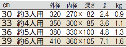 サイズの目安:30cm→約3人用、33cm→約4人用、36cm→約5人用、39cm→約6人用
