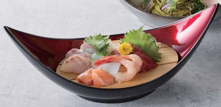 尺一信玄盛器 レッドパール裏黒 樹脂製は、とてもオシャレで高級感のある器です。お造りなど和食の盛り付けに好評です。材質のABS樹脂は、軽くて衝撃に強く割れにくく耐久性に優れています。器と目皿は別売りなので用途に合わせてご利用ください。(目皿は食洗機不可です)
