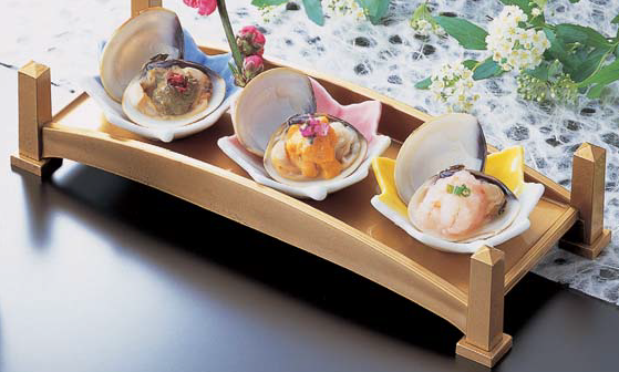 錦盛橋 金パールは、前菜の盛り付けに便利な細長い器です。少量を数品盛り付けられます。材質の耐熱ABS樹脂は、軽くて衝撃に強く割れにくく耐久性に優れています。盛箱用小鉢パーツもあります。