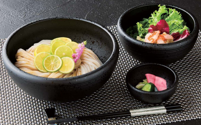 千筋 ナツメ鉢 黒タタキは、ご飯もの、汁物、麺類、お雑煮まで多目的に使用できる器です。φ90mmの小鉢からφ198mmの丼まで5サイズありますので用途に合わせて選択ください。