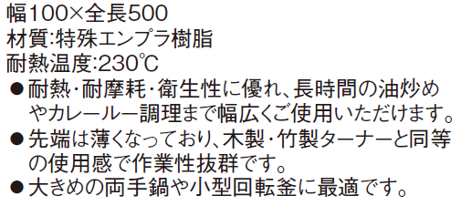 ウルトラ耐熱 ハセガワターナーは、耐熱、耐摩耗性、衛生性に優れ、長時間の油炒めやカレールー調理まで幅広くご使用いただけます。先端は薄くなっており、木製、竹製ターなーと同等の使用感で作業性抜群です。耐熱温度230℃は、フライパンで炒め物ができます。木製ターナーの欠点、欠ける、焦げる、ひび割れる、削れるの全てを改善したターナーです。