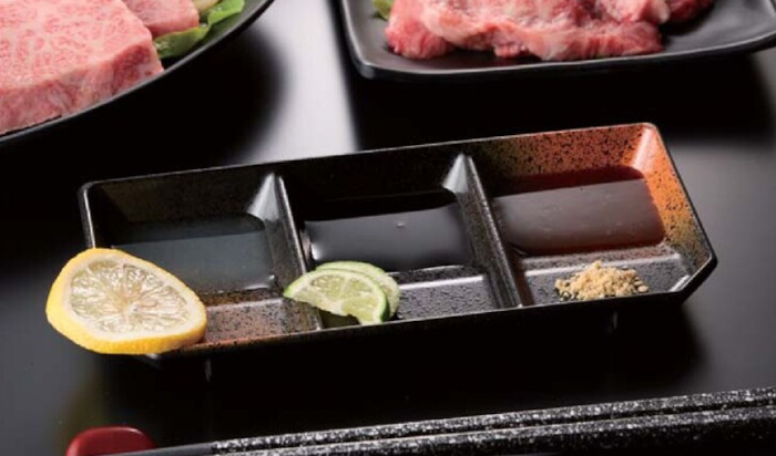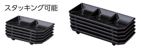 ABS 二種タレ皿・三種タレ皿 焼きしめは、焼肉などのタレ皿に好評です。複数のたれを入れられるのでとても便利です。収納時はスタッキングできるので、バイキングスタイルや焼肉に便利です。食器洗浄機対応なので業務用に最適です。
