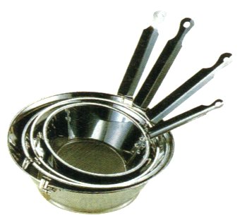 18-0ステンレス油こしは、業務用で使用する最も一般的な油こしです。鍋の上に置きやすいように取手の反対側にフックが付いています。天ぷらや中華料理で使用した油を濾す道具です。この商品は本体とアミが一体なので、網の取り替えは出来ません。
