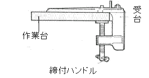 1)缶切機の取付け受台を作業台に締付ハンドルでしっかりと取付けます。