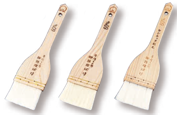 木柄 ナイロン・アクリル・ヤンルック ハケは、人口毛のタレハケです。柔らかい毛が食材を痛めません。写真左はナイロン、中央はアクリル、右はヤンルックです。