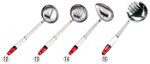 鍋からスープをすくうにはスープレードルが便利です。容量が細分化されてますので一定容量をよそえます。形状は、縦型、横型、穴明きなどがあります。和食用にはお玉があり、穴明きと穴無があります。本職用としては、天丼、うな重などに必須なタレかけなどもあります。 材質はステンレス製が主流です。