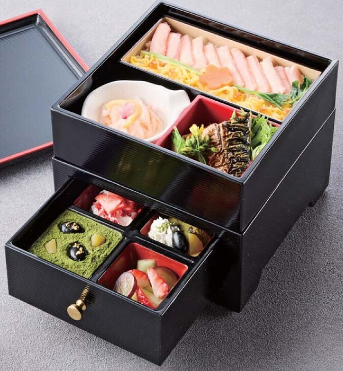 5寸 嵐山松花堂 盆蓋セット 黒天朱は、オシャレな2段重ねの松花堂弁当容器です。蓋と親と引き出しパーツの4点セットです。本体材質のABS樹脂製は衝撃にも強く割れにくく、耐久性に優れ塗料の密着も良好です。