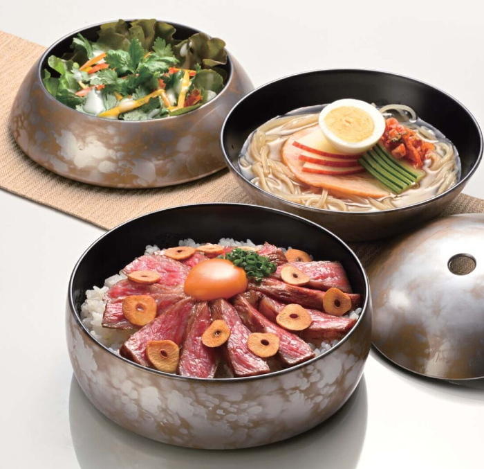 球体重は、球体を4つにスライスした形状で3段重ねの弁当容器です。5色のバリエーションがあります。本体材質の耐熱ABS樹脂製は衝撃にも強く割れにくく、耐久性に優れ塗料の密着も良好です。食器洗浄機対応なので営業用に最適です。
