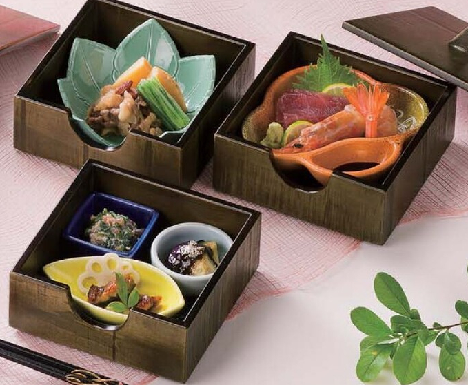 木製 4.3寸 のぞき松花堂 よもぎ塗は、木製の松花堂弁当箱です。木の質感が和の雰囲気を演出します。蓋と親は別売りなので、お好みの段数で使用できます。写真は3段ですが、お好みの段数でご使用ください。なお、写真の食器類は付属してません。