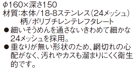 テボは、麺を1人前ずつ茹でる便利な道具です。細いソーメンを通さないように網目はきわめて細い24メッシュです。丸底タイプです。茹でるとき便利なデカてぼ専用リングに使用できます。